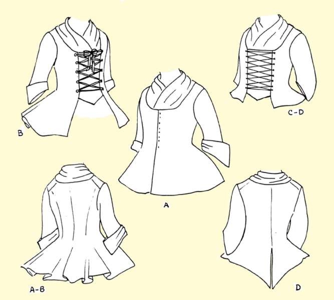 Affectionately known as The Chocolate Girl's jacket or casaquin. $150.00 labor plus materials and shipping. This jacket is seen with many style variations. It is basically the juste with godets, tight fitting sleeves with and without cuffs and various stomacher closings and lacings.